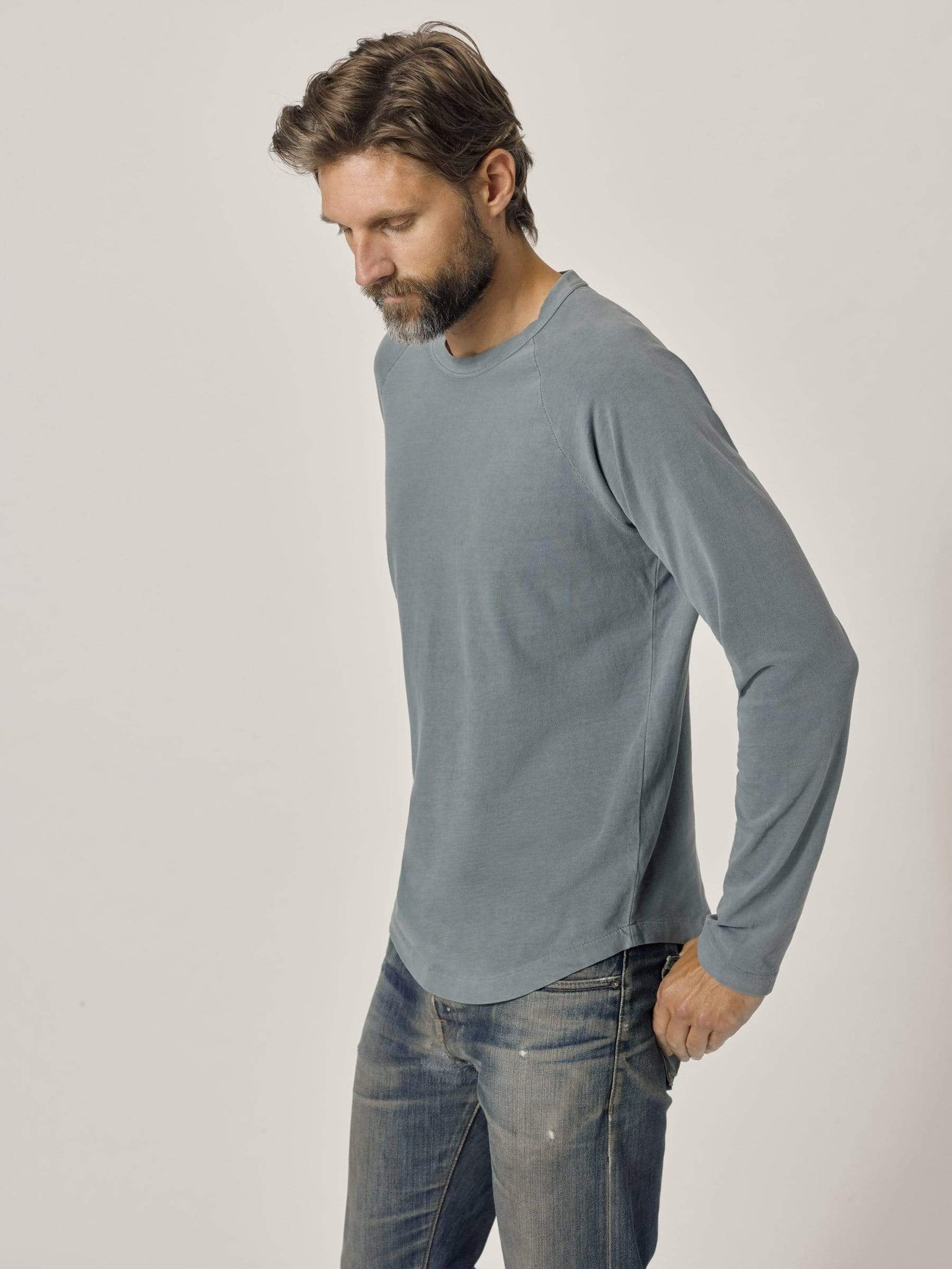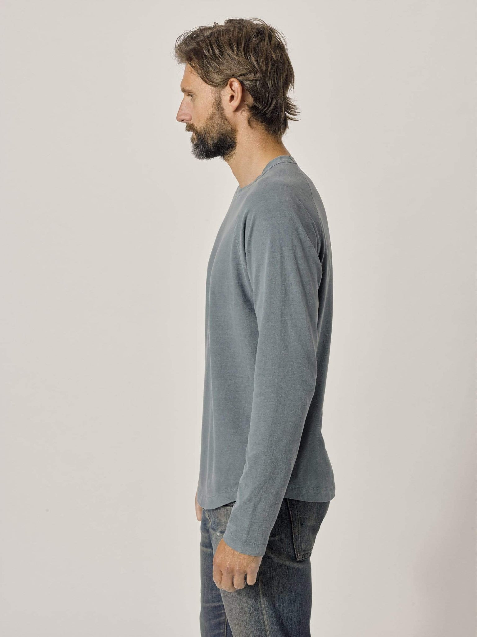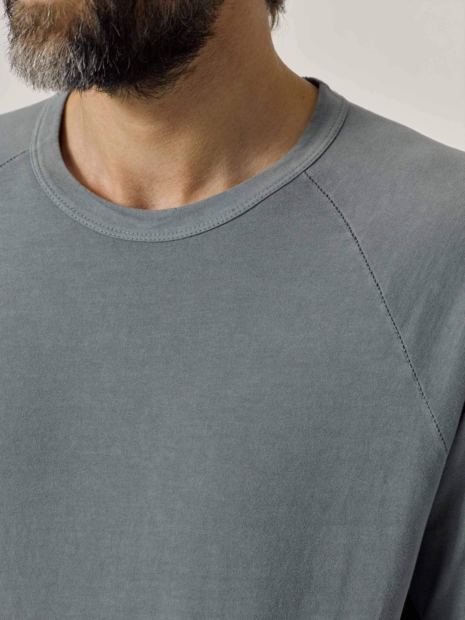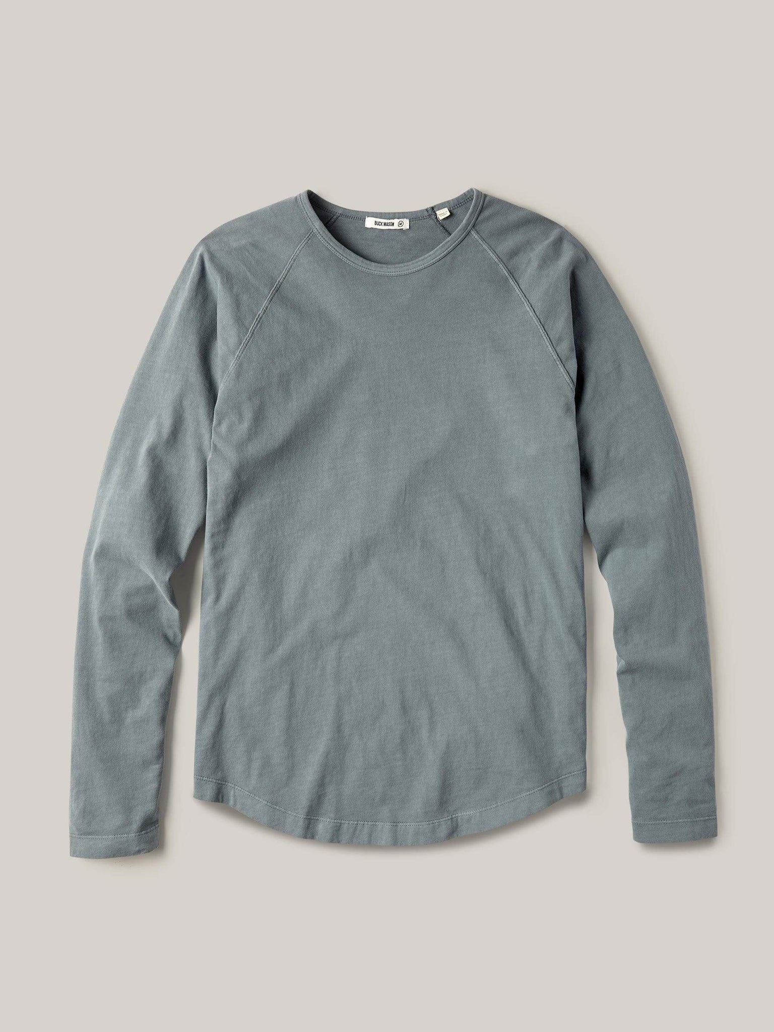 A long-sleeve raglan cut from soft, brushed cotton. Raglan sleeves are cut from the neck to the armpit, and offer a broad range of motion through the arm. The fabric is a lightweight cotton jersey, sanded on the outside for a warm, soft texture.