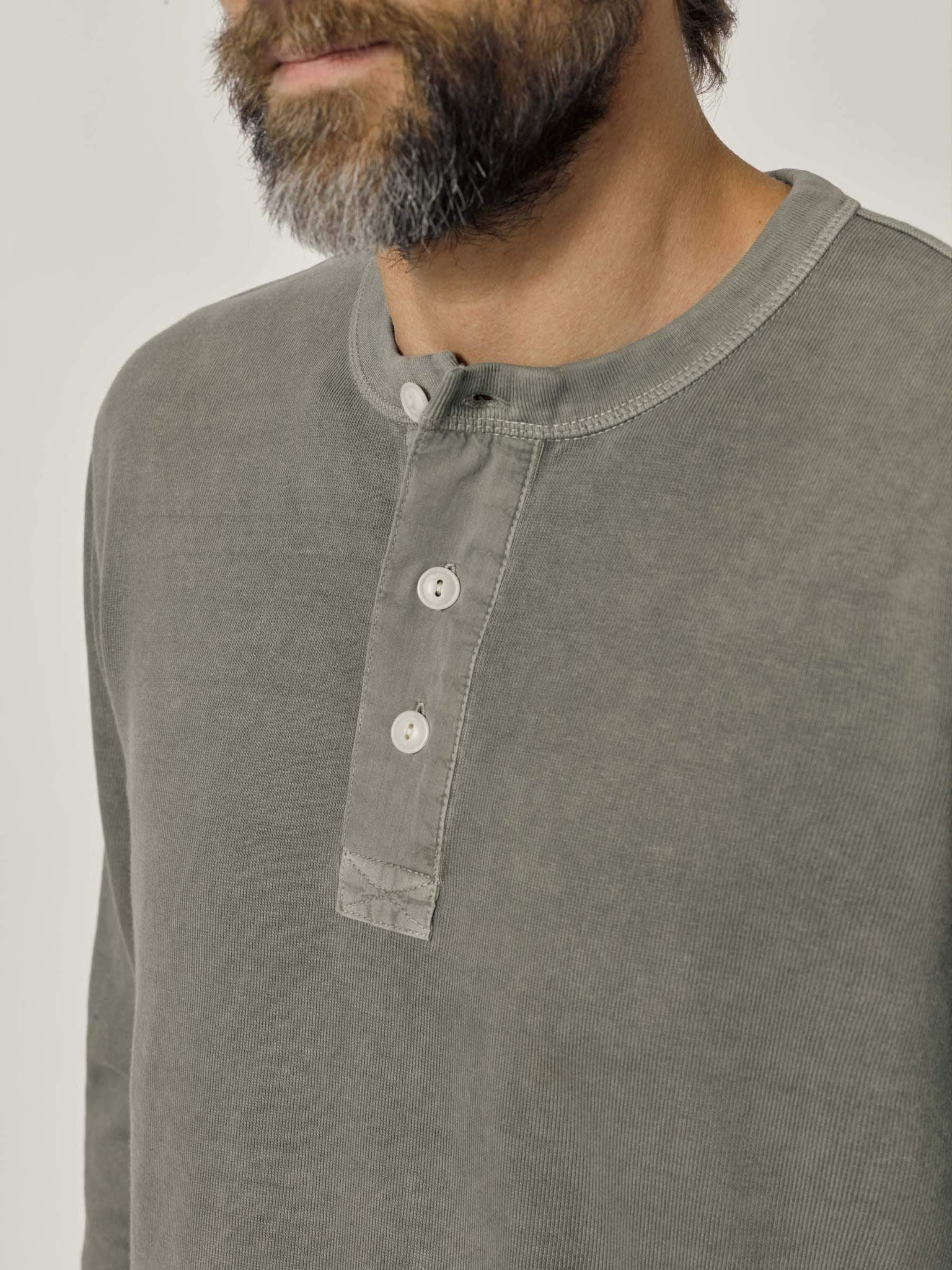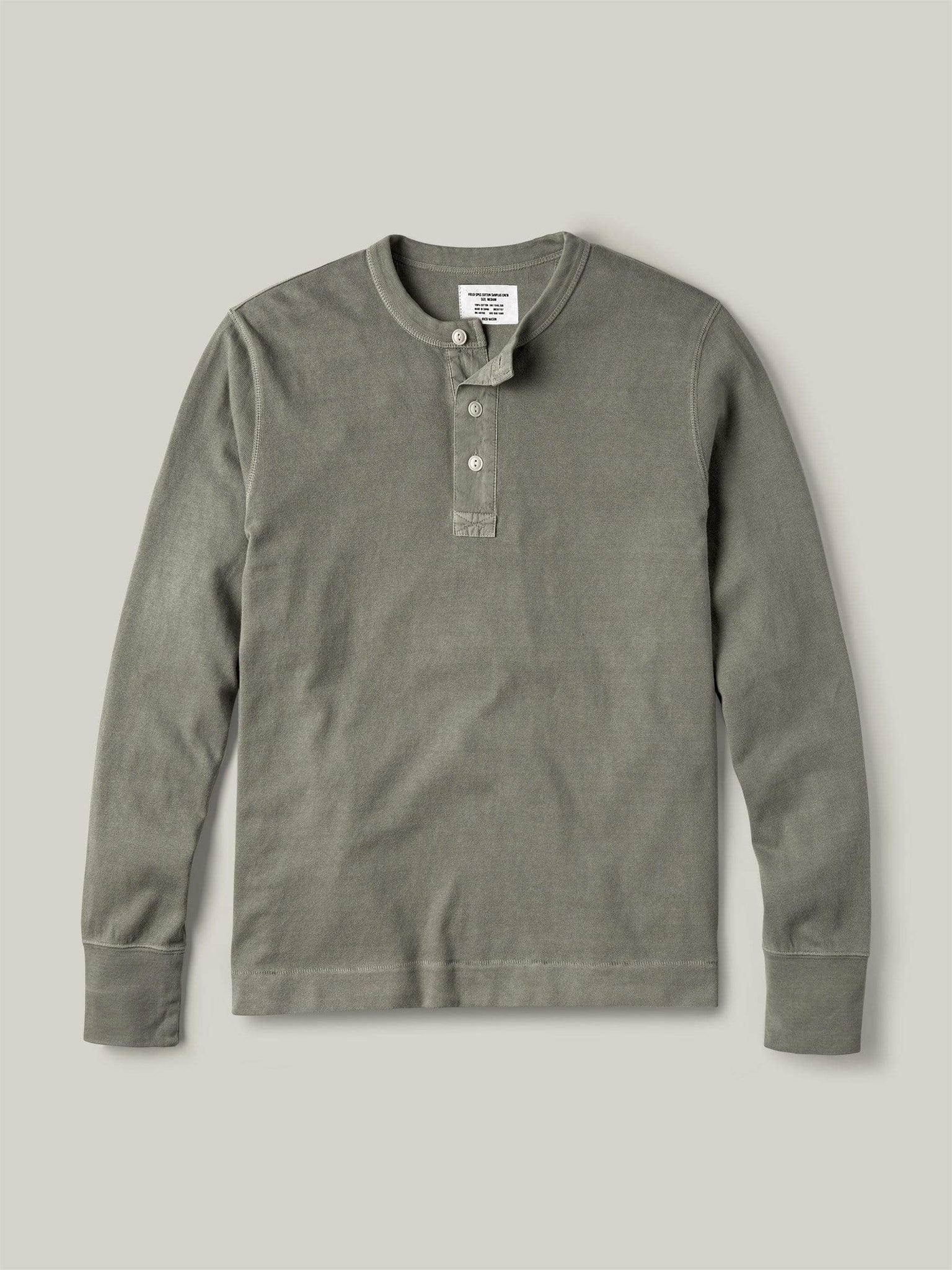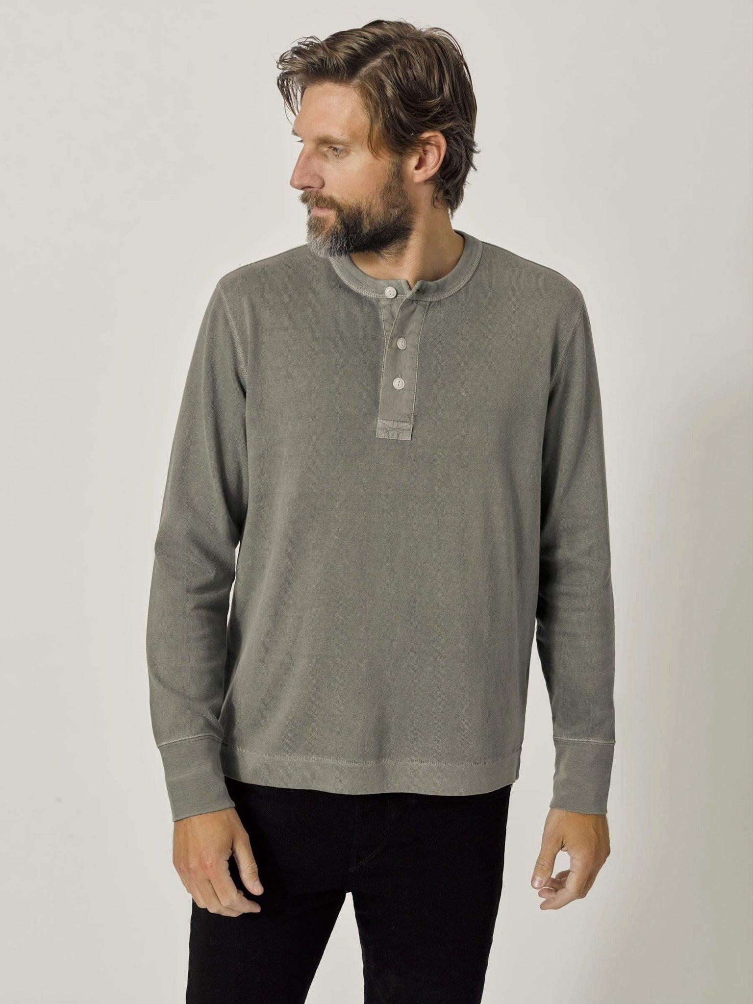 A loose-cut, long sleeve, heavy weight henley, modeled after a vintage athletic shirt. The soft, cotton jersey is about three times heavier than our Pima tee. This is a solid, substantial base-layer for colder weather.