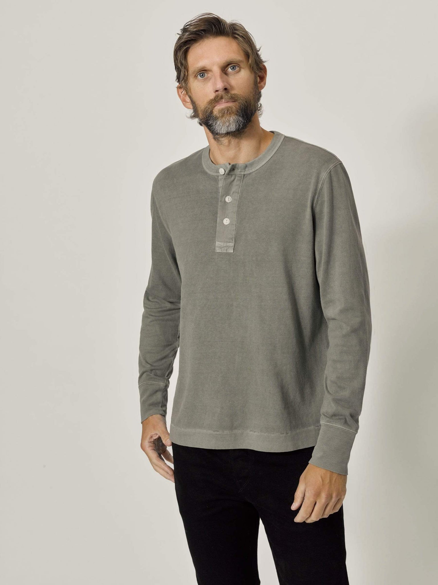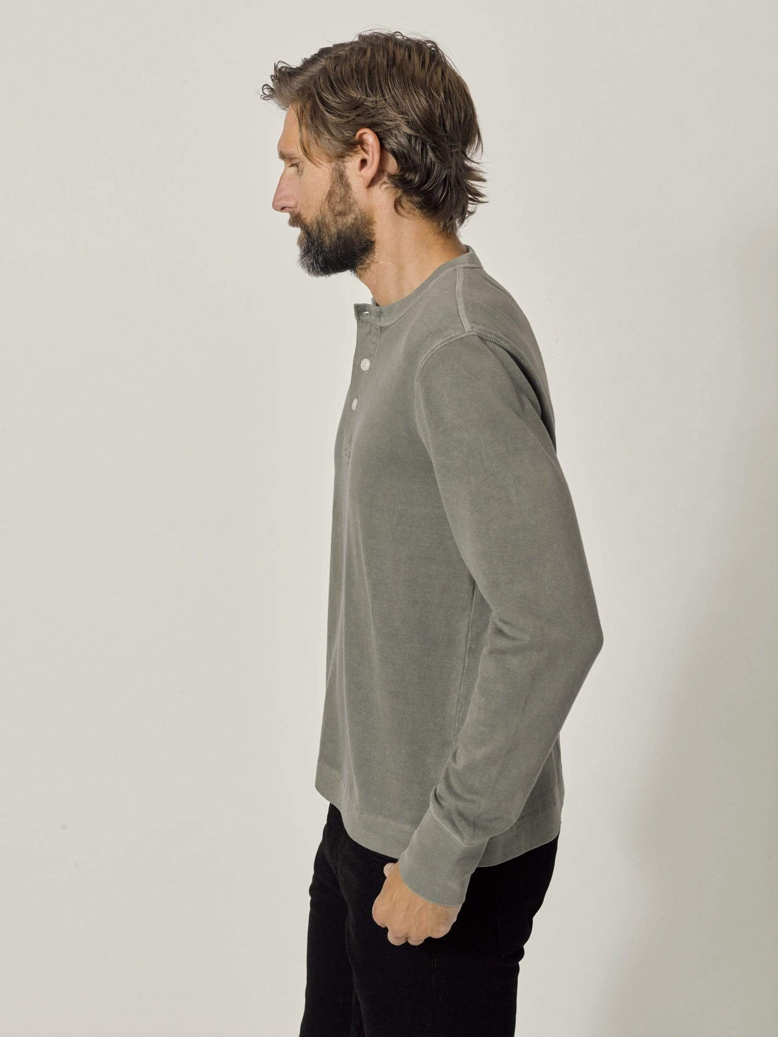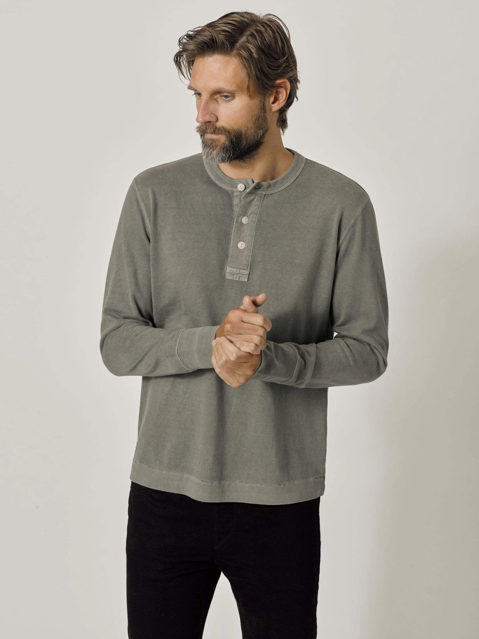 A loose-cut, long sleeve, heavy weight henley, modeled after a vintage athletic shirt. The soft, cotton jersey is about three times heavier than our Pima tee. This is a solid, substantial base-layer for colder weather.