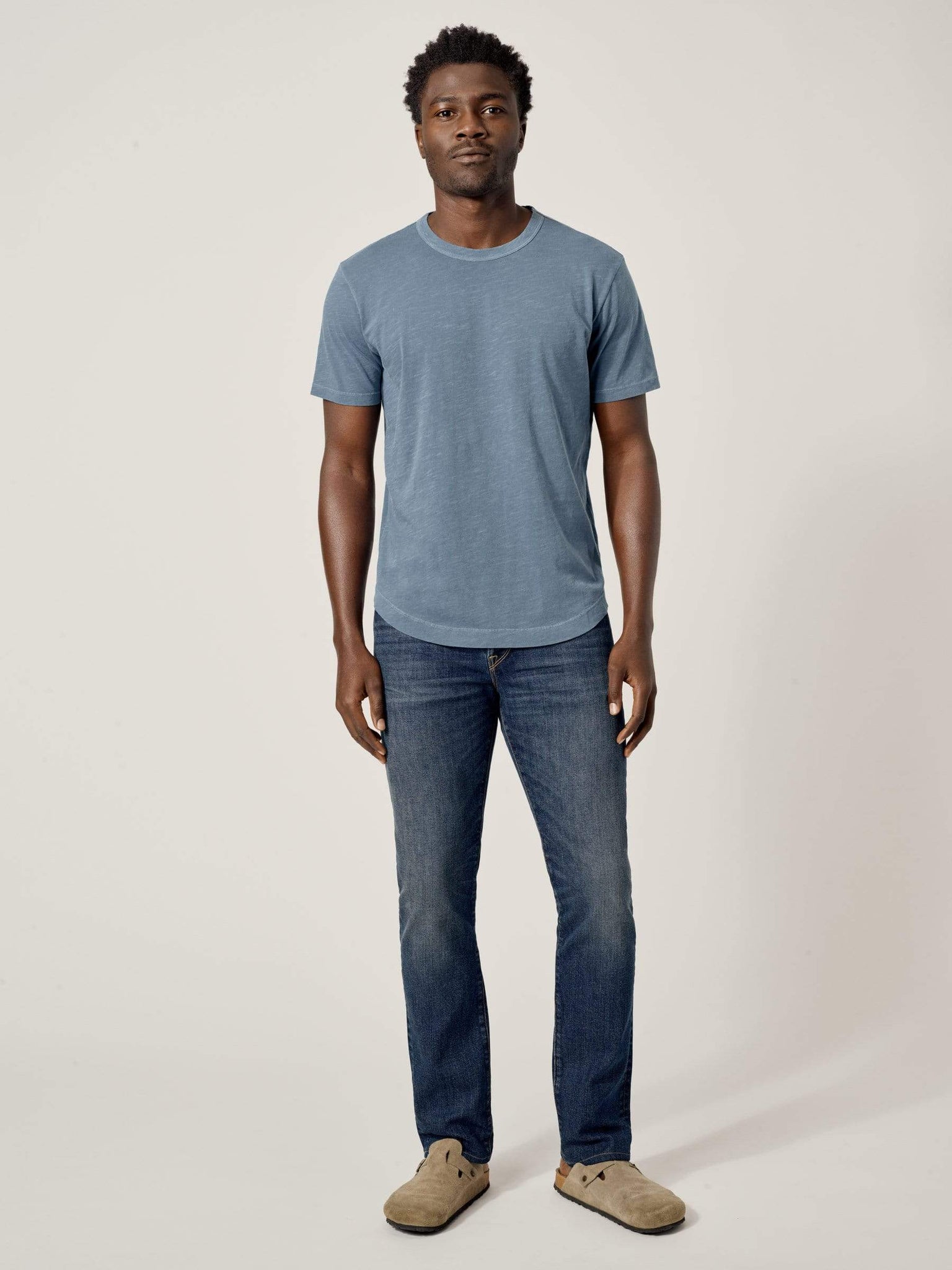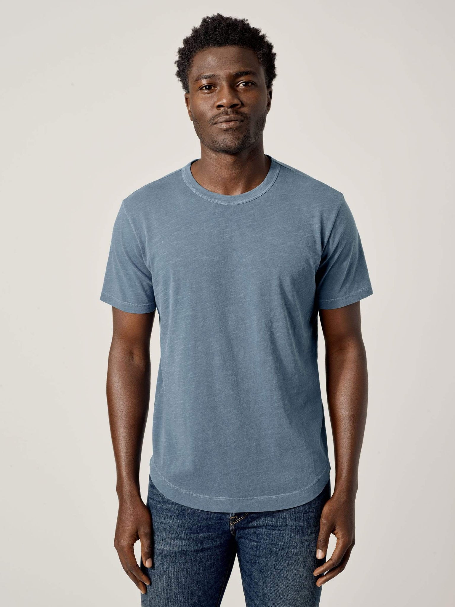 Our slub curved hem tee is built from beautiful 100% slub cotton. Slub is a lightly textured fabric made on small batch, low-tension looms. The neck opening leaves room to breathe, while the rounded shirttail lends a tailored look to an everyday essential.